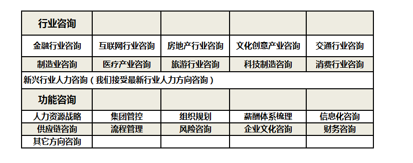 6、人力咨询:我们目前只接受定制化的人力咨询项目,具体资费请联系我们咨询部的同事,咨询部同事会根据实际需求提供服务方案。